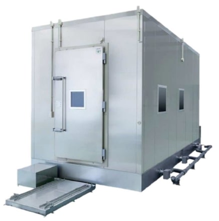 食品工場向けの急速凍結装置「 フリーザー 」を開発から設計、施工しております。-35℃ の高圧な冷風を上下から吹き付け、30 分程度で食品の温度を-18℃ 以下に下げることができます。