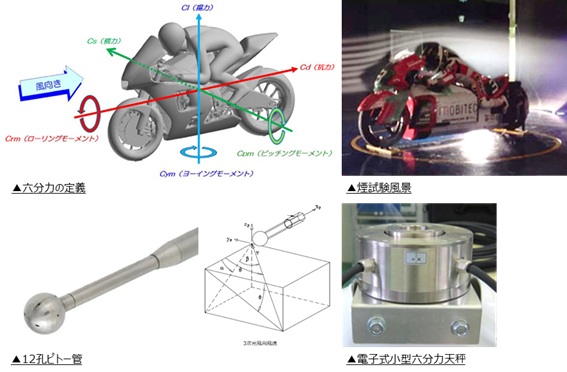 風洞試験の事例では、試作したモックアップ車両を六分力天秤に設置し、風荷重を計測することによって、力、モーメントの無次元数を算出します。認知度の高いCd値を例にすると、可能な限り低い値になるようモックアップ車両の形状を変更し、燃費向上、最高速度向上を狙います。風の流れを把握するため煙試験や12孔ピトー管、電子式天秤を用いた可視化試験や各種計測も行っています。