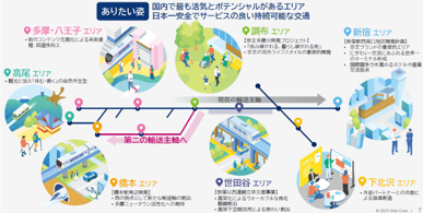 沿線価値や企業価値を高めるため、駅を核とした沿線の大規模開発の推進に加え、外部パートナーとの共創などによりハード・ソフト一体での「まちづくり」に取り組むとともに、基盤となる運輸業においては、DX技術の活用による安全性や生産性、サービスの向上など、「新たな時代に向けた交通の創造」を目指しています。