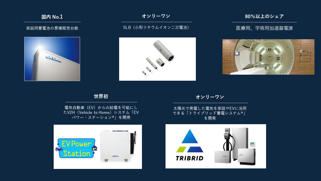 当社は、コンデンサおよびエネルギー・環境関連製品を中心とした NECST(Nichicon Energy Control System Technology)製品を開発・製造・販売する企業です。