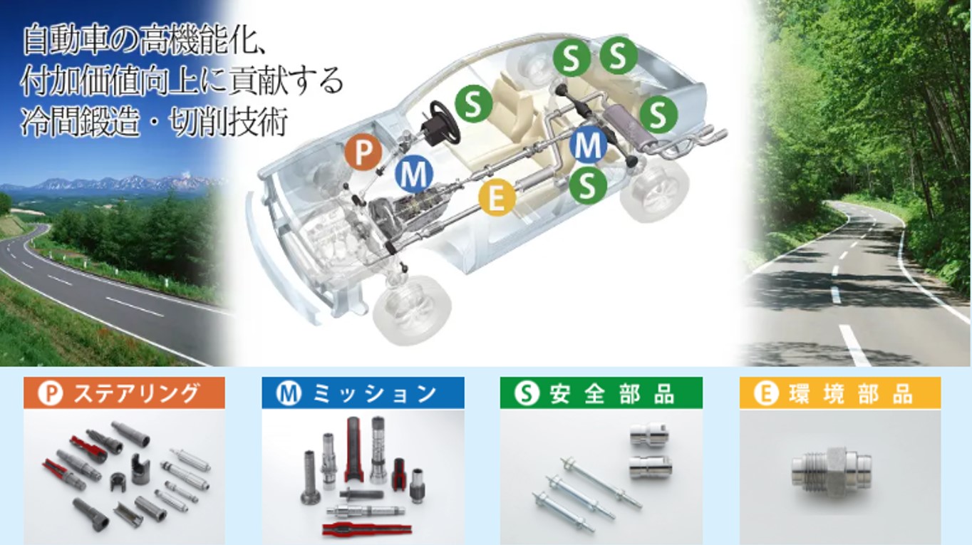 自動車の進行方向を制御するステアリング部品、トランスミッション(変速機)に使用される駆動系部品、シートベルトやエアバックに使用される安全部品、O2やNOxの濃度測定センサーに使用される環境部品
