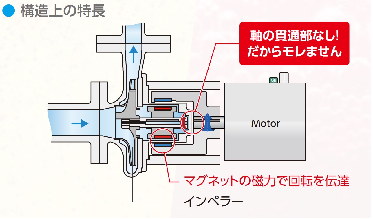 このように、マグネットポンプは密閉容器(ケーシング)に穴を開けずに羽根車を回すことが出来るため、液体が漏れることがありません。