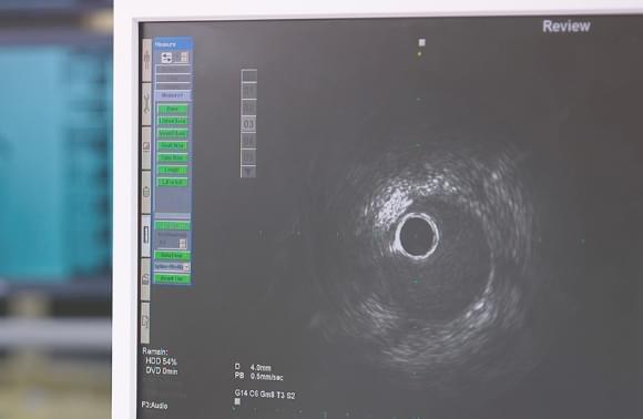 心筋梗塞や狭心症などの虚血性心疾患に用いられるカテーテル治療。このカテーテル治療の前の病態診断や治療後のステント留置の評価に使われるのが、「血管内イメージング(画像診断)」です。血管内イメージングには、血管壁、プラークの性質、病変長、対象血管径などを定量的に計測することが可能な血管内超音波検査法(Intravescular Ultrasound, IVUS)と高い解像度を有する光干渉断層診断法(Optical Frequency Domain Imaging, OFDI)の2つの方法があり、テルモはこの両方の技術を保有している数少ない企業です。高速演算処理により、リアルタイムに生じる心臓や肺の動きによる画像のずれを補正し、画像から血管形状やカテーテルの位置を検出させ、医療現場における診断を支援しています。