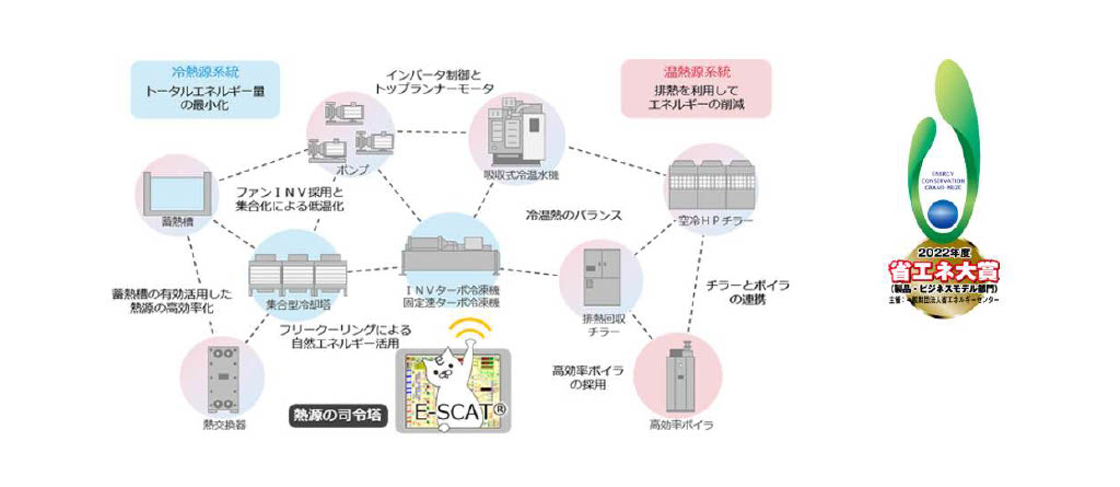 E-SCAT®(Energy Smart Command for Airconditioningof TONETS)は、刻々と変化する負荷や外気条件の変動に応じて、熱源システム全体で最も効率が良い運転となるよう各機器を一括制御するコントローラです。